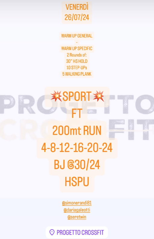 Pubblicato daprogettocrossfit26 luglio 202431 luglio 2024Pubblicato in: Wod Condividi: Fai clic per condividere su X (Si apre in una nuova finestra) X Fai clic per condividere su Facebook (Si apre in una nuova finestra) Facebook Mi piace Caricamento... Correlati
