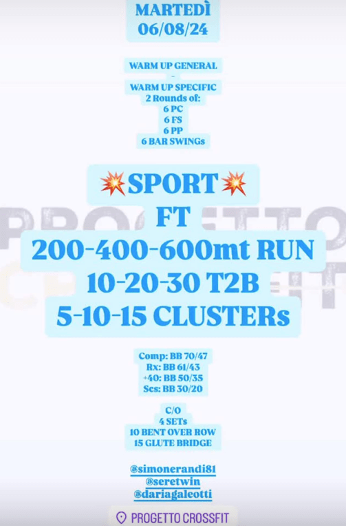 Pubblicato daprogettocrossfit6 agosto 202420 agosto 2024Pubblicato in: Wod Condividi: Fai clic per condividere su X (Si apre in una nuova finestra) X Fai clic per condividere su Facebook (Si apre in una nuova finestra) Facebook Mi piace Caricamento... Correlati