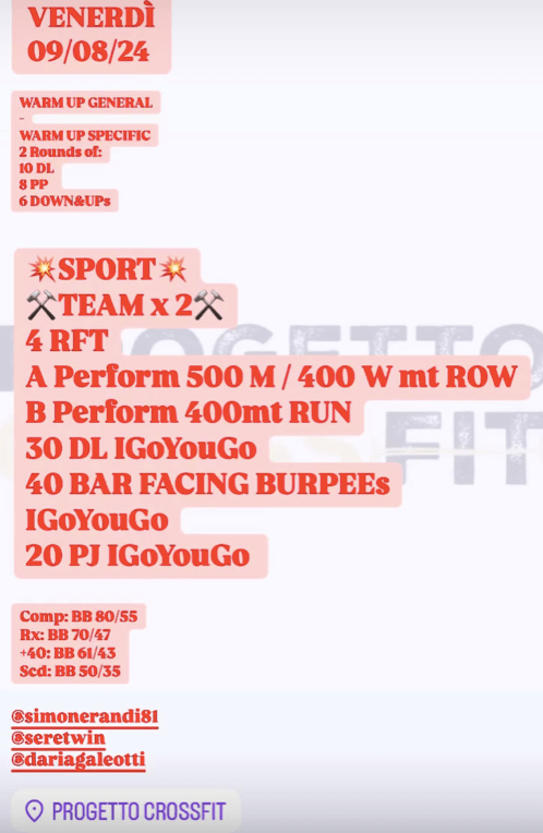 Pubblicato daprogettocrossfit9 agosto 202420 agosto 2024Pubblicato in: Wod Condividi: Fai clic per condividere su X (Si apre in una nuova finestra) X Fai clic per condividere su Facebook (Si apre in una nuova finestra) Facebook Mi piace Caricamento... Correlati