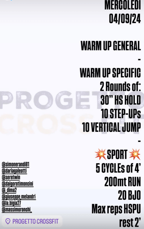 Pubblicato daprogettocrossfit4 settembre 202425 settembre 2024Pubblicato in: Wod Condividi: Fai clic per condividere su X (Si apre in una nuova finestra) X Fai clic per condividere su Facebook (Si apre in una nuova finestra) Facebook Mi piace Caricamento... Correlati