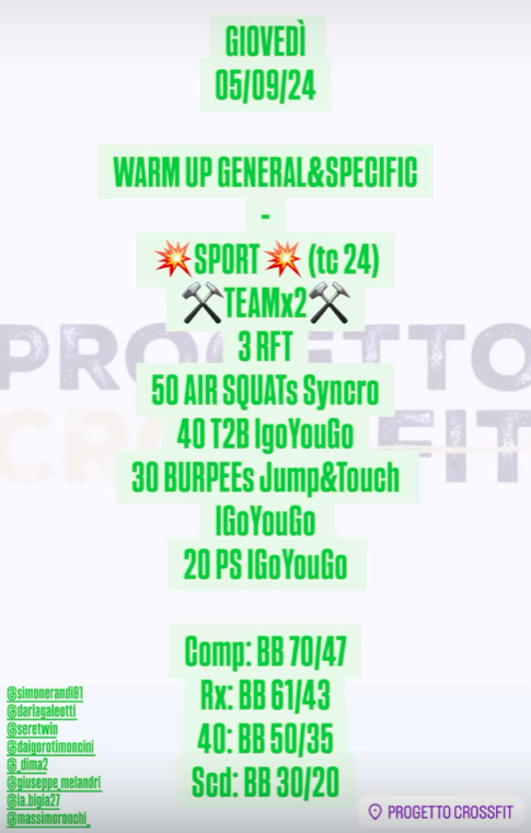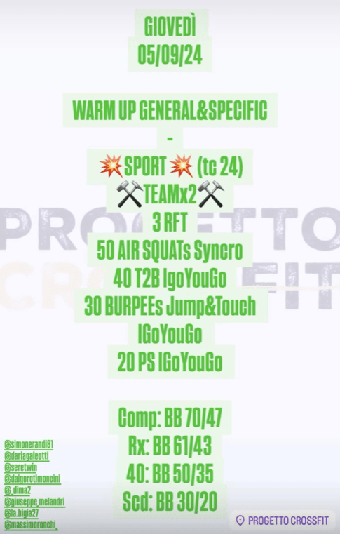 Pubblicato daprogettocrossfit5 settembre 202425 settembre 2024Pubblicato in: Wod Condividi: Fai clic per condividere su X (Si apre in una nuova finestra) X Fai clic per condividere su Facebook (Si apre in una nuova finestra) Facebook Mi piace Caricamento... Correlati