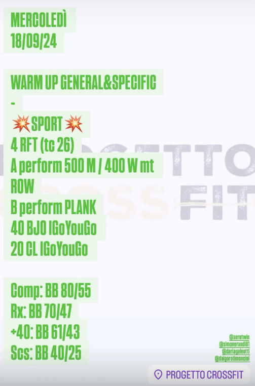 Pubblicato daprogettocrossfit18 settembre 202425 settembre 2024Pubblicato in: Wod Condividi: Fai clic per condividere su X (Si apre in una nuova finestra) X Fai clic per condividere su Facebook (Si apre in una nuova finestra) Facebook Mi piace Caricamento... Correlati