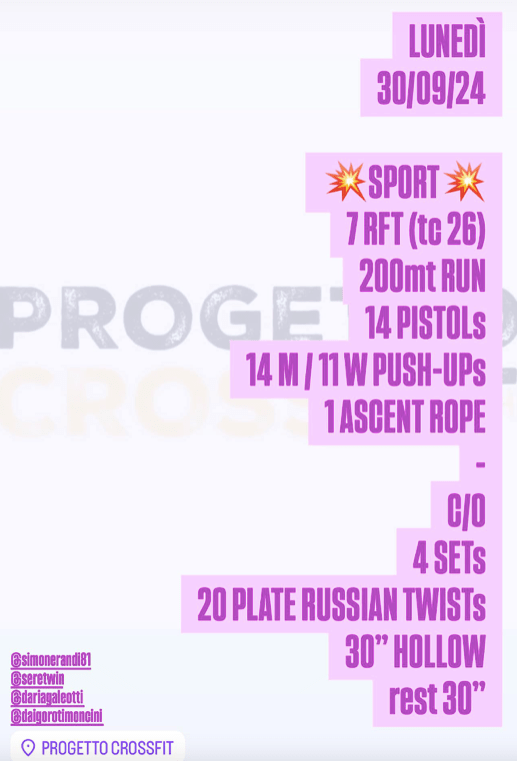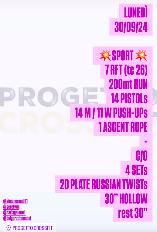 Pubblicato daprogettocrossfit30 settembre 20249 ottobre 2024Pubblicato in: Wod Condividi: Fai clic per condividere su X (Si apre in una nuova finestra) X Fai clic per condividere su Facebook (Si apre in una nuova finestra) Facebook Mi piace Caricamento... Correlati