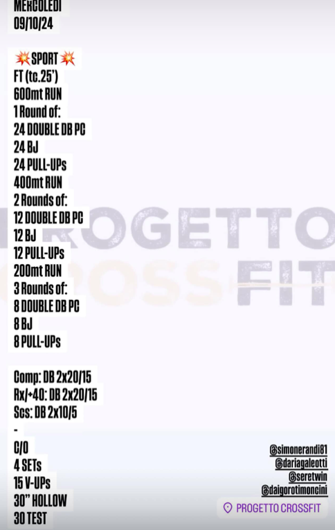 Pubblicato daprogettocrossfit9 ottobre 2024Pubblicato in: Wod Condividi: Fai clic per condividere su X (Si apre in una nuova finestra) X Fai clic per condividere su Facebook (Si apre in una nuova finestra) Facebook Mi piace Caricamento... Correlati