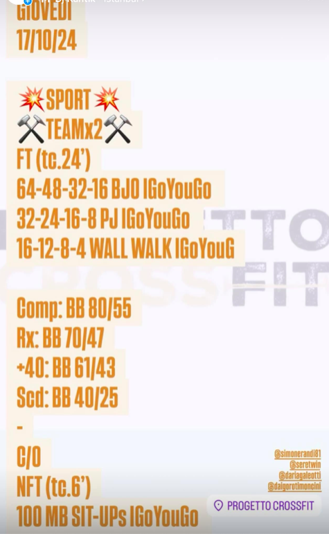 Pubblicato daprogettocrossfit17 ottobre 202431 ottobre 2024Pubblicato in: Wod Condividi: Fai clic per condividere su X (Si apre in una nuova finestra) X Fai clic per condividere su Facebook (Si apre in una nuova finestra) Facebook Mi piace Caricamento... Correlati