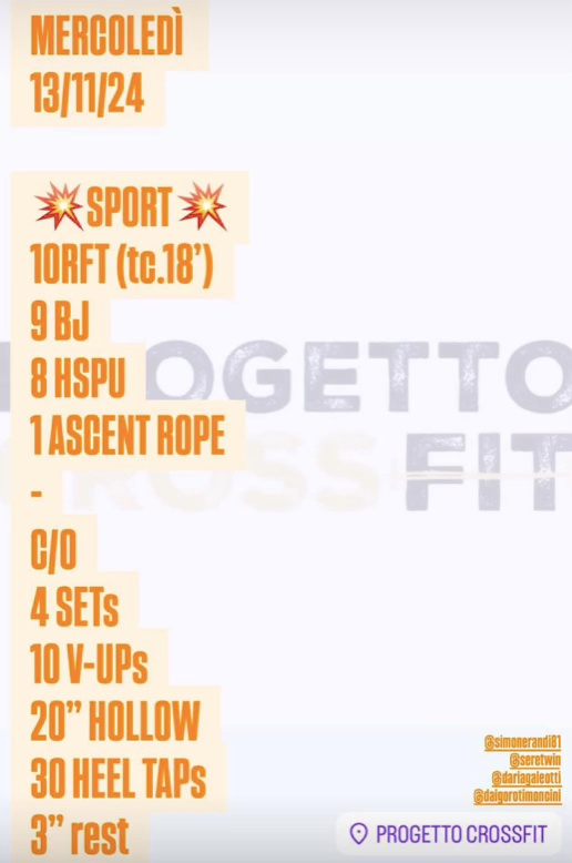 Pubblicato daprogettocrossfit13 novembre 202428 novembre 2024Pubblicato in: Wod Condividi: Fai clic per condividere su X (Si apre in una nuova finestra) X Fai clic per condividere su Facebook (Si apre in una nuova finestra) Facebook Mi piace Caricamento... Correlati