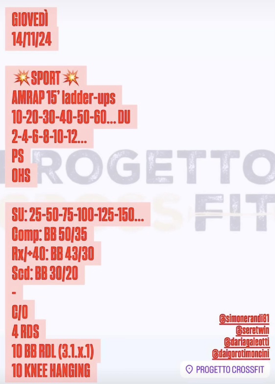 Pubblicato daprogettocrossfit14 novembre 202428 novembre 2024Pubblicato in: Wod Condividi: Fai clic per condividere su X (Si apre in una nuova finestra) X Fai clic per condividere su Facebook (Si apre in una nuova finestra) Facebook Mi piace Caricamento... Correlati