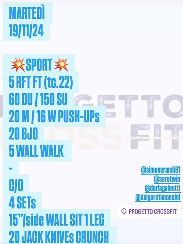 Pubblicato daprogettocrossfit19 novembre 202428 novembre 2024Pubblicato in: Wod Condividi: Fai clic per condividere su X (Si apre in una nuova finestra) X Fai clic per condividere su Facebook (Si apre in una nuova finestra) Facebook Mi piace Caricamento... Correlati