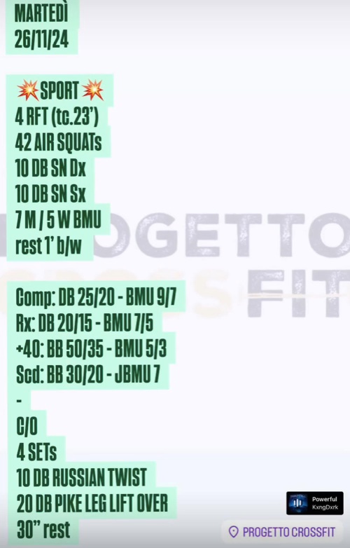 Pubblicato daprogettocrossfit26 novembre 202428 novembre 2024Pubblicato in: Wod Condividi: Fai clic per condividere su X (Si apre in una nuova finestra) X Fai clic per condividere su Facebook (Si apre in una nuova finestra) Facebook Mi piace Caricamento... Correlati