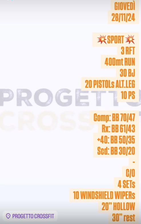 Pubblicato daprogettocrossfit28 novembre 2024Pubblicato in: Wod Condividi: Fai clic per condividere su X (Si apre in una nuova finestra) X Fai clic per condividere su Facebook (Si apre in una nuova finestra) Facebook Mi piace Caricamento... Correlati