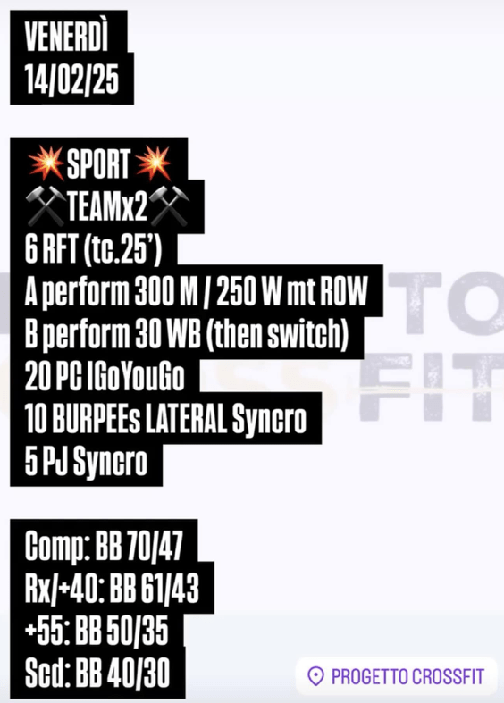 Pubblicato daprogettocrossfit14 febbraio 202515 marzo 2025Pubblicato in: Wod Condividi: Fai clic per condividere su X (Si apre in una nuova finestra) X Fai clic per condividere su Facebook (Si apre in una nuova finestra) Facebook Mi piace Caricamento... Correlati