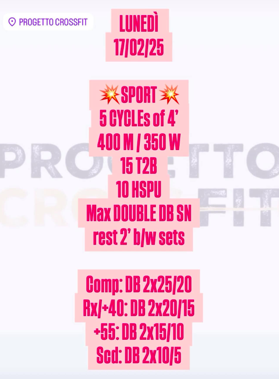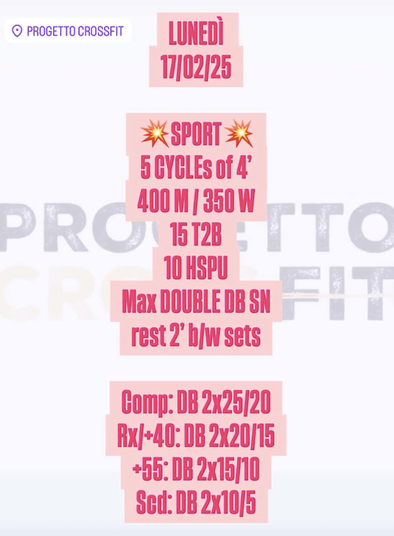 Pubblicato daprogettocrossfit17 febbraio 202515 marzo 2025Pubblicato in: Wod Condividi: Fai clic per condividere su X (Si apre in una nuova finestra) X Fai clic per condividere su Facebook (Si apre in una nuova finestra) Facebook Mi piace Caricamento... Correlati