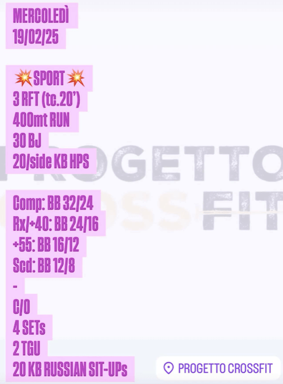 Pubblicato daprogettocrossfit19 febbraio 202515 marzo 2025Pubblicato in: Wod Condividi: Fai clic per condividere su X (Si apre in una nuova finestra) X Fai clic per condividere su Facebook (Si apre in una nuova finestra) Facebook Mi piace Caricamento... Correlati