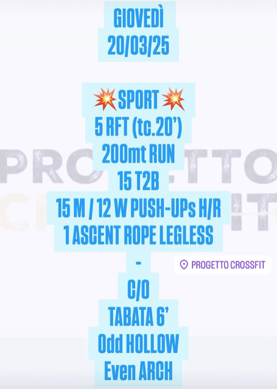 Pubblicato daprogettocrossfit20 marzo 20257 aprile 2025Pubblicato in: Wod Condividi: Fai clic per condividere su X (Si apre in una nuova finestra) X Fai clic per condividere su Facebook (Si apre in una nuova finestra) Facebook Mi piace Caricamento... Correlati