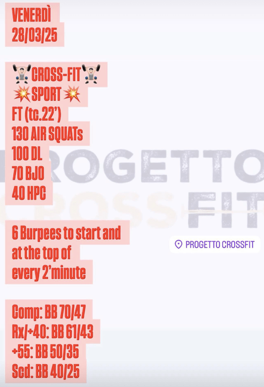 Pubblicato daprogettocrossfit28 marzo 20257 aprile 2025Pubblicato in: Wod Condividi: Fai clic per condividere su X (Si apre in una nuova finestra) X Fai clic per condividere su Facebook (Si apre in una nuova finestra) Facebook Mi piace Caricamento... Correlati
