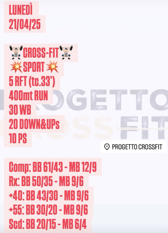 Pubblicato daprogettocrossfit21 aprile 202522 aprile 2025Pubblicato in: Wod Condividi: Fai clic per condividere su X (Si apre in una nuova finestra) X Fai clic per condividere su Facebook (Si apre in una nuova finestra) Facebook Mi piace Caricamento... Correlati