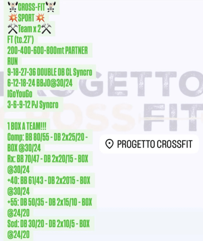 Pubblicato daprogettocrossfit13 giugno 202520 luglio 2025Pubblicato in: Wod Condividi: Fai clic per condividere su X (Si apre in una nuova finestra) X Fai clic per condividere su Facebook (Si apre in una nuova finestra) Facebook Mi piace Caricamento... Correlati