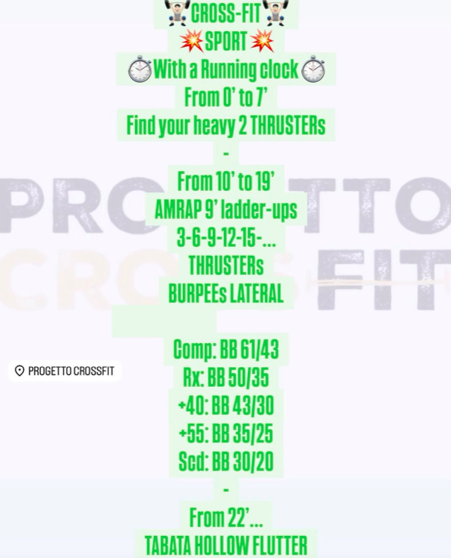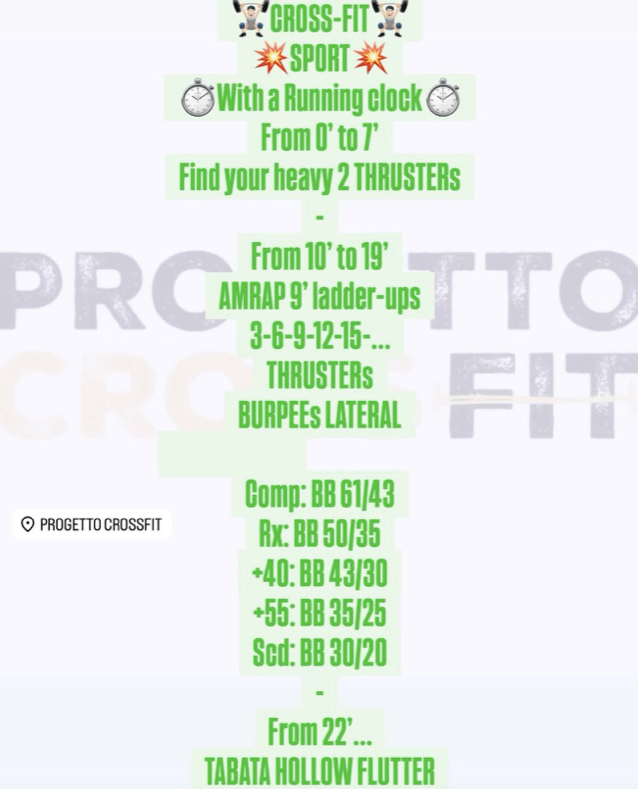 Pubblicato daprogettocrossfit28 agosto 20257 settembre 2025Pubblicato in: Wod Condividi: Fai clic per condividere su X (Si apre in una nuova finestra) X Fai clic per condividere su Facebook (Si apre in una nuova finestra) Facebook Mi piace Caricamento... Correlati