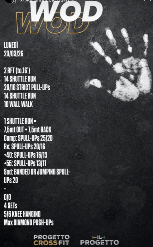 Pubblicato daprogettocrossfit23 marzo 20268 aprile 2026Pubblicato in: Wod Condividi: Condividi su X (Si apre in una nuova finestra) X Condividi su Facebook (Si apre in una nuova finestra) Facebook Mi piace Caricamento... Correlati