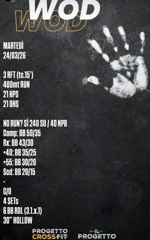 Pubblicato daprogettocrossfit24 marzo 20268 aprile 2026Pubblicato in: Wod Condividi: Condividi su X (Si apre in una nuova finestra) X Condividi su Facebook (Si apre in una nuova finestra) Facebook Mi piace Caricamento... Correlati