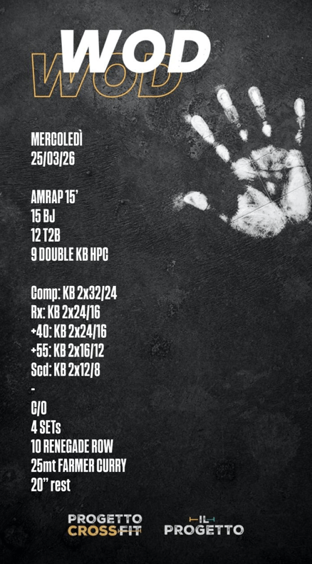 Pubblicato daprogettocrossfit25 marzo 20268 aprile 2026Pubblicato in: Wod Condividi: Condividi su X (Si apre in una nuova finestra) X Condividi su Facebook (Si apre in una nuova finestra) Facebook Mi piace Caricamento... Correlati