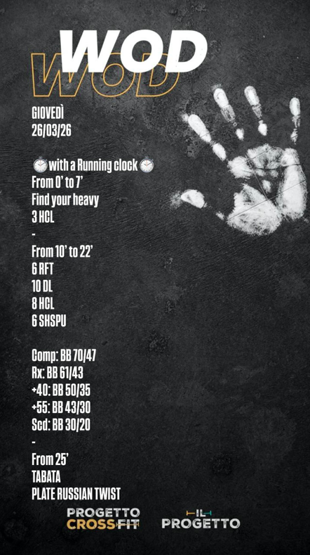 Pubblicato daprogettocrossfit26 marzo 20268 aprile 2026Pubblicato in: Wod Condividi: Condividi su X (Si apre in una nuova finestra) X Condividi su Facebook (Si apre in una nuova finestra) Facebook Mi piace Caricamento... Correlati