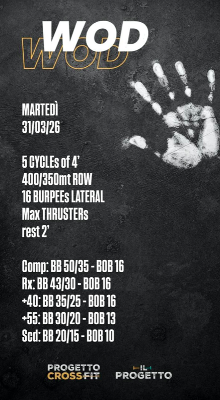 Pubblicato daprogettocrossfit31 marzo 20268 aprile 2026Pubblicato in: Wod Condividi: Condividi su X (Si apre in una nuova finestra) X Condividi su Facebook (Si apre in una nuova finestra) Facebook Mi piace Caricamento... Correlati