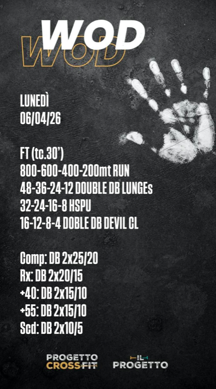 Pubblicato daprogettocrossfit6 aprile 20268 aprile 2026Pubblicato in: Wod Condividi: Condividi su X (Si apre in una nuova finestra) X Condividi su Facebook (Si apre in una nuova finestra) Facebook Mi piace Caricamento... Correlati
