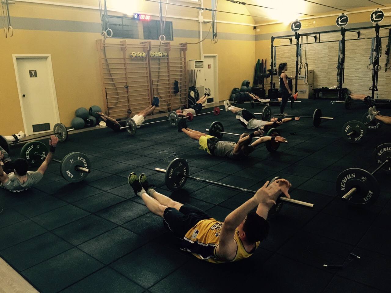 Lunedì 18/05/15 Warm Up Gymnastic & Strength 4×5 Strict Push Ups 10 D.U. rest 1′ WOD B.I. 50 Thruster @20/15 then 45 Sit-Ups 40 Push Press@ 40/25 35 D.U. 30 Sit-Ups 25 Push-Jerk@40/25 20 D.U. 15 Sit-Ups 10 STOH @60/25 5 D.U.