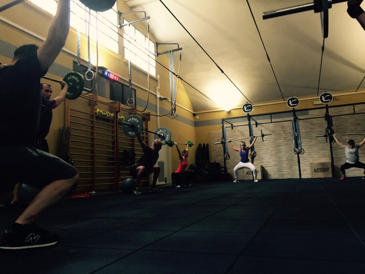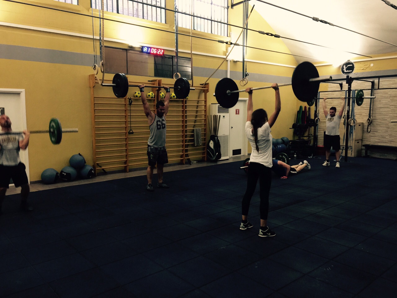 Lunedì 27/04/15 Warm Up Gymnastic & Strength EMOM 10′ ODD 4 OHS with 3″ iso in bottom position +4 Burpee over BB EVEN strict K2E WOD : AMRAP 12″ 6 OHS @50/30 8 K2E 10 Burpee over BB CO 5X10 V-Ups